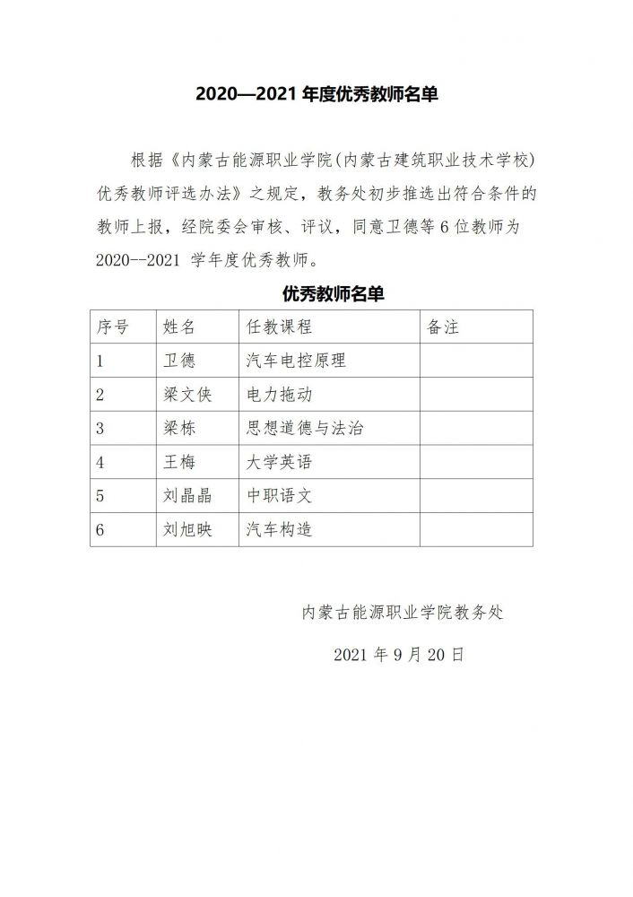 2020—2021年度優(yōu)秀教師名單