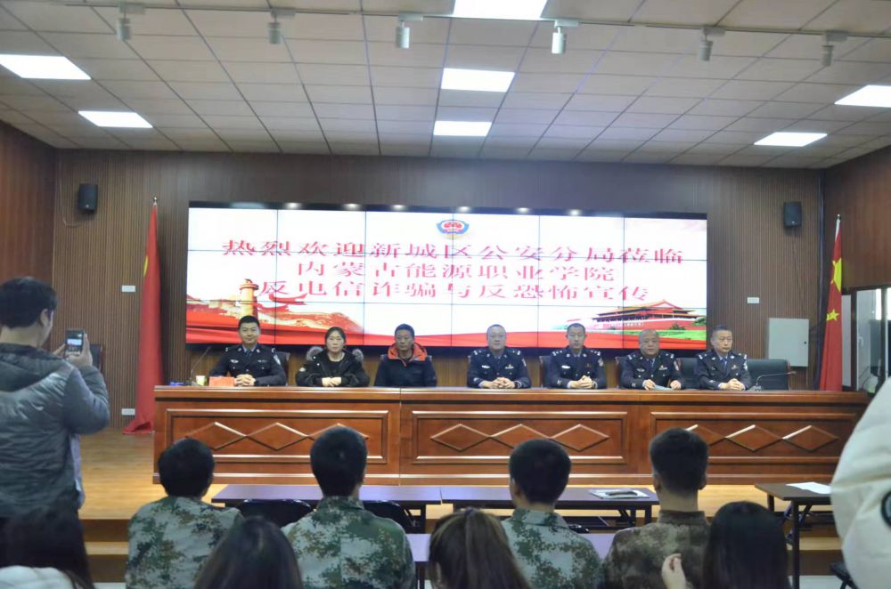 為進一步深入黨史學(xué)習(xí)教育活動,為師生辦實事,加強校園安全管理,嚴(yán)防發(fā)生校園暴力事件,提升師生反恐防暴意識,有效防范電信網(wǎng)絡(luò)詐騙犯罪,切實提高師生的反詐防騙意識,2021年12月22日下午,內(nèi)蒙古能源職業(yè)學(xué)院邀請新城區(qū)公安分局治安管理大隊、反恐怖和特巡警大隊、刑偵大隊智慧偵查中心民警走進校園,為學(xué)院師生現(xiàn)場開展法治教育及反恐防范教育、反電詐宣傳教育。