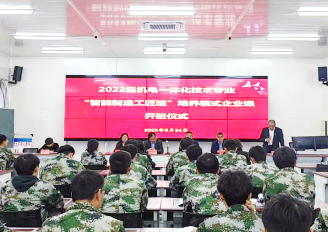 機電一體化專業(yè)帶頭人、“智能制造工匠班”導(dǎo)師付曉波首先感謝企業(yè)領(lǐng)導(dǎo)的支持和精心組織,并對派駐學(xué)院授課的企業(yè)專家表示熱烈歡迎。還介紹了什么是智能制造,以及智能制造未來的發(fā)展方向如何等專業(yè)情況,同時也對學(xué)生提出了要求,希望珍惜這次企業(yè)課程的學(xué)習(xí)機會,嚴(yán)格遵守工匠班管理制度,積極與老師交流互動,達(dá)到最優(yōu)學(xué)習(xí)效果。
