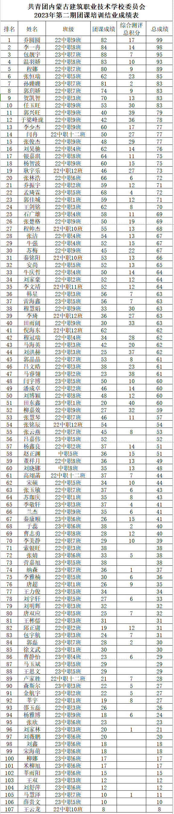 共青團內蒙古建筑職業(yè)技術學校委員會2023年第二期團課培訓結業(yè)成績公示