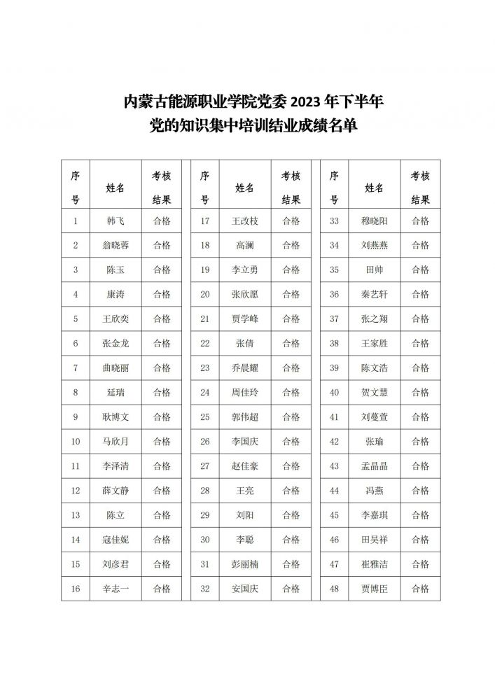 按照學(xué)院黨委入黨積極分子、黨員發(fā)展對象培訓(xùn)工作安排,2023年下半年黨的知識集中培訓(xùn)工作已結(jié)束。根據(jù)集中培訓(xùn)結(jié)業(yè)考試成績等各方面綜合表現(xiàn),現(xiàn)將本期培訓(xùn)班結(jié)業(yè)名單公示如下,詳見附件。