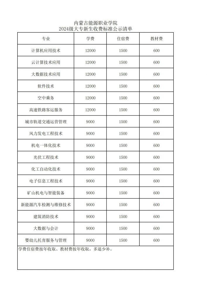 內(nèi)蒙古能源職業(yè)學(xué)院2024級大專新生收費標準公示清單