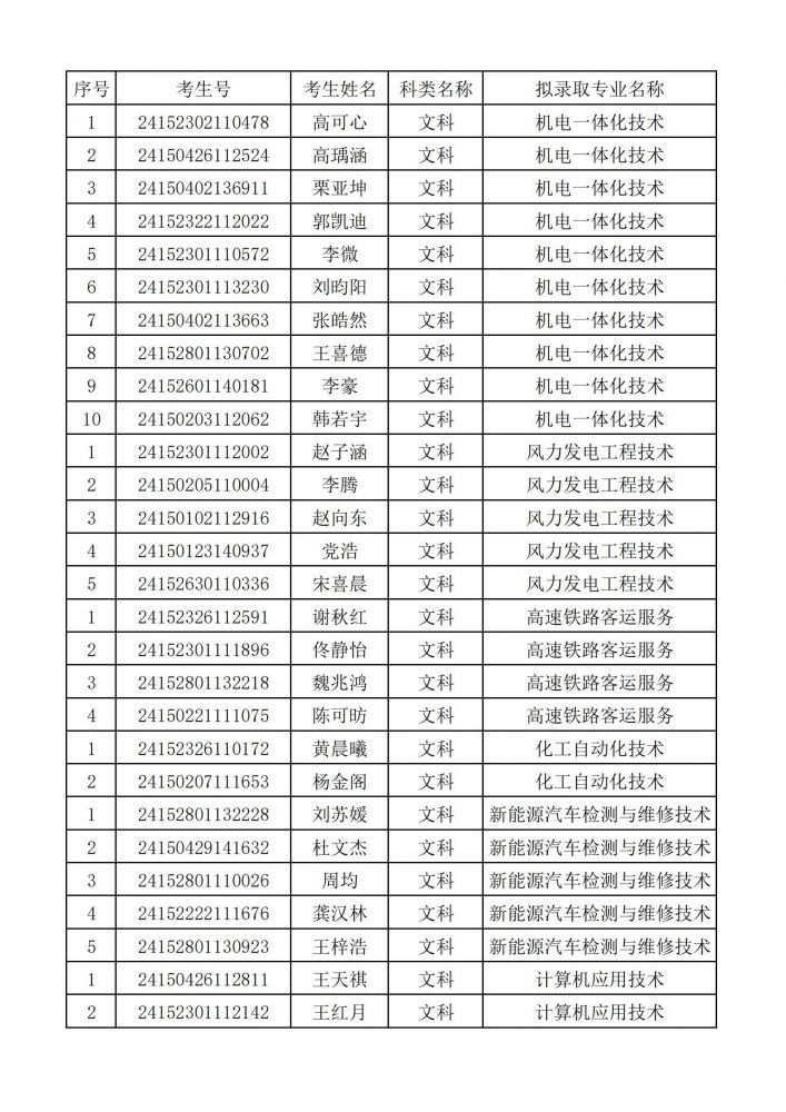 根據(jù)《關(guān)于做好2024年高等職業(yè)院校單獨(dú)考試招生工作的通知》(內(nèi)教招考普〔2024〕3號(hào))的文件精神和《內(nèi)蒙古能源職業(yè)學(xué)院2024年單獨(dú)招生實(shí)施方案》的工作安排。根據(jù)專業(yè)志愿清錄取原則,2024年單獨(dú)考試招生工作領(lǐng)導(dǎo)小組對(duì)我校2024年單獨(dú)考試招生錄取名單進(jìn)行審核,經(jīng)審核,決定對(duì)225名考生擬錄取,現(xiàn)予以公示。待內(nèi)蒙古教育招生考試中心審核后,正式錄取名單在內(nèi)蒙古招生考試信息網(wǎng)公布。